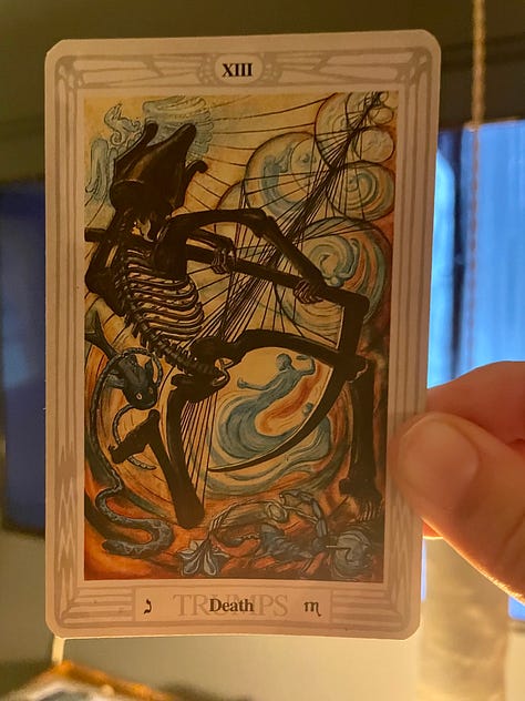 I drew the Thoth Death card the morning after Christmas but had forgotten I had drawn it by dusk, in the moment my husband and I decided to watch Orpheus. Although I’d attended my first conference in grad school on the merits of an essay I’d written about Cocteau’s La Belle et La Bête, I’d never seen his Orpheus, nor read about it. I hadn’t anticipated the slant meditation on Death, maybe silly given my preoccupations in earlier years with Cocteau’s slant meditations on Beauty. When I’d drawn the card, I thought it was speaking, on a personal level, to the particular post-holiday slump that comes from being the mother of a child who struggles with food anxiety, not to mention the keeper of a past self who spent multiple summer solstices shuttered up in eating-disorder rehab. Just a few weeks before, I’d been expressing relief to a friend about how far I feel from that miserable version of myself, the twenty-something who had tended to the horrors of death on the crime beat with the “precisely calculated defiance”5 of purging after dinners and writing poetry during homicide trials.
